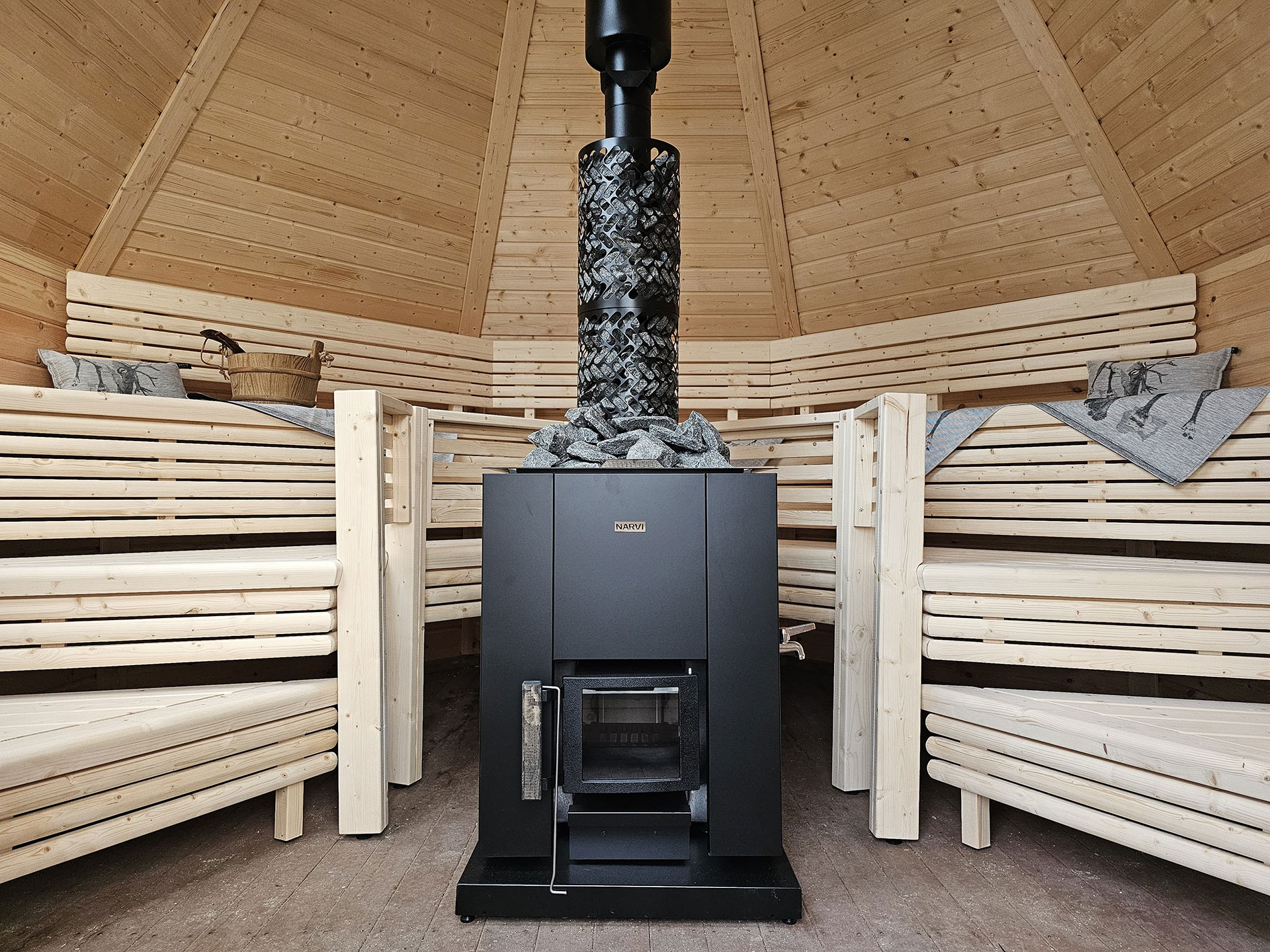 Kåtabastun som lämpar sig för en mindre gårdsplan har ändå gott om utrymme för upp till 8–10 personer. Aggregatet har placerats i mitten av bastun, så ångan fördelas mjukt och jämnt i utrymmet. Det branta taket och bastun är dimensionerade på ett sådant sätt att lavarna placeras tillräckligt högt så det inte blir kallt om tårna.